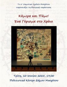 - 19:00, Πολιτιστικό Κέντρο «Θεόδωρος Αγγελόπουλος» (Μοσχάτο): Το 6ο Δημοτικό Σχολείο παρουσιάζει τη θεατρική παράσταση «Κάμερα και πάμε: Ένα γύρισμα στο χρόνο».