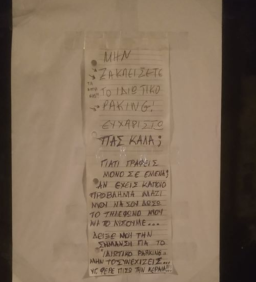 Μόλις όμως το είδε ο άνθρωπος που είχε αφήσει εκεί το αυτοκίνητό του, φρόντισε να του γράψει απάντηση: «Πας καλά; Γιατί γράφεις μόνο σε εμένα; Αν έχεις κάποιο πρόβλημα μαζί μου να σου δώσω το τηλέφωνό μου να το λύσουμε… Δείξε μου την σήμανση για το ιδιωτικό parking. Μην το συνεχίζεις».