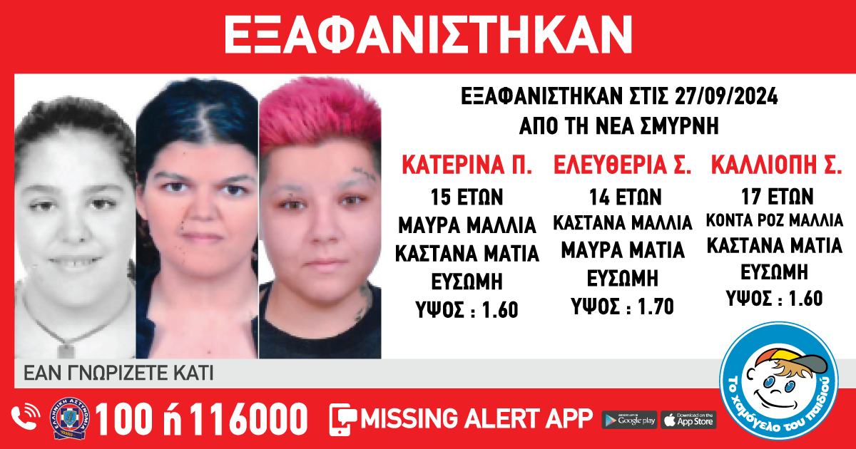 Στις 27/09/2024, μεσημεριανές ώρες, εξαφανίστηκαν από χώρο φιλοξενίας στην περιοχή της Νέας Σμύρνης Αττικής, η Κατερίνα Π., 15 ετών, η Ελευθερία Σ., 14 ετών και η Καλλιόπη Σ., 17 ετών. Για τις ανήλικες Κατερίνα και Ελευθερία, υπάρχουν πληροφορίες πως βρίσκονται στην περιοχή της Θεσσαλονίκης. «Το Χαμόγελο του Παιδιού» ενημερώθηκε σήμερα,28/09/2024, και άμεσα προχώρησε στη δημοσιοποίηση των στοιχείων των ανήλικων, καθώς συντρέχουν λόγοι που θέτουν τη ζωή τους σε κίνδυνο .