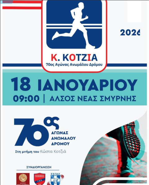 Η Κυριακή 18 Ιανουαρίου σηματοδοτεί τη διεξαγωγή του 70ου ιστορικού αγώνα ανώμαλου δρόμου «Κ. Κοτζιάς» στο Άλσος Νέας Σμύρνης. Η διοργάνωση, που αποτελεί θεσμό για την τοπική κοινωνία, πραγματοποιείται από τον ΠΑΝΙΩΝΙΟ Γ.Σ.Σ με τη συνδιοργάνωση του Δήμου Νέας Σμύρνης και τελεί υπό την αιγίδα του ΣΕΓΑΣ.