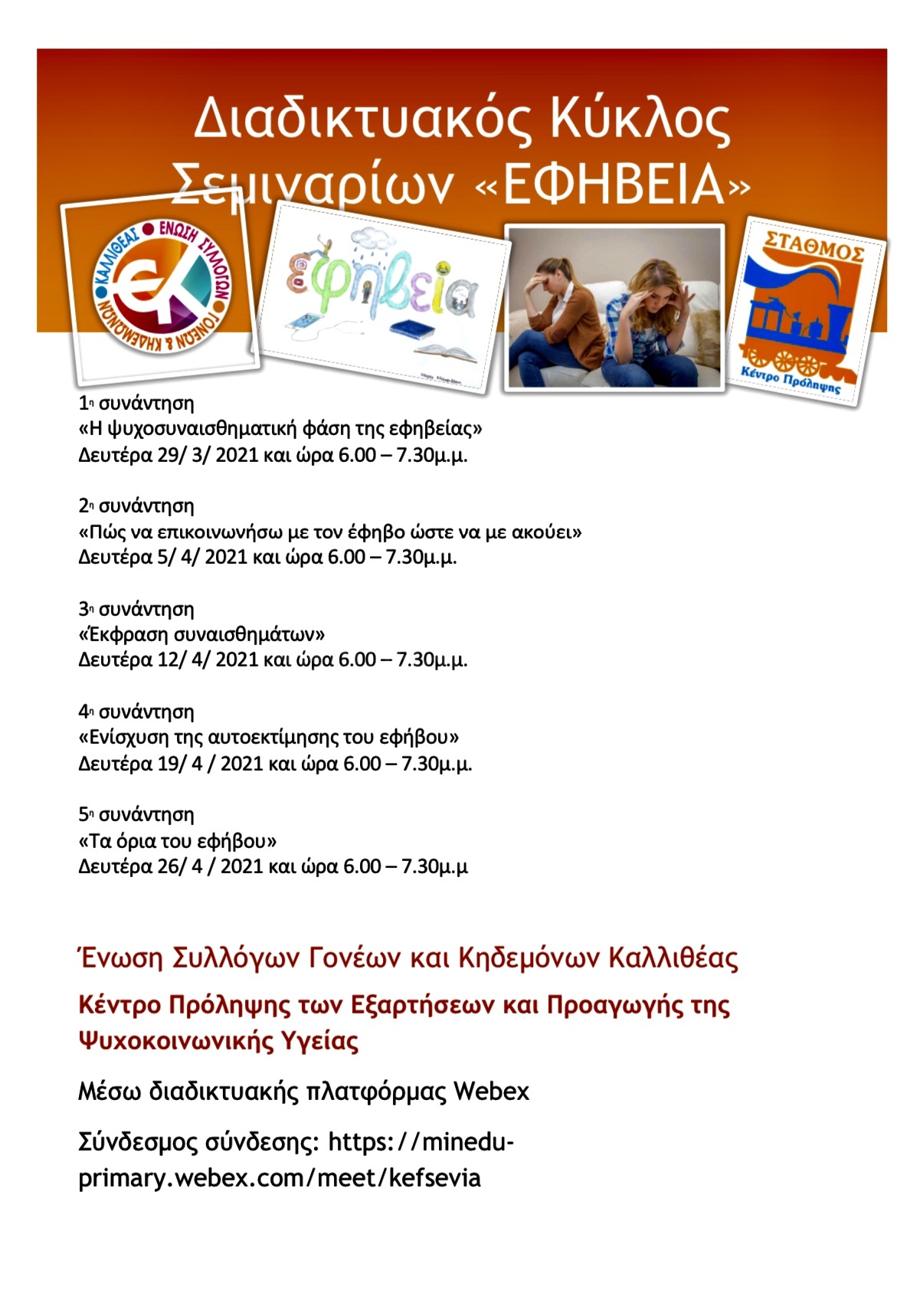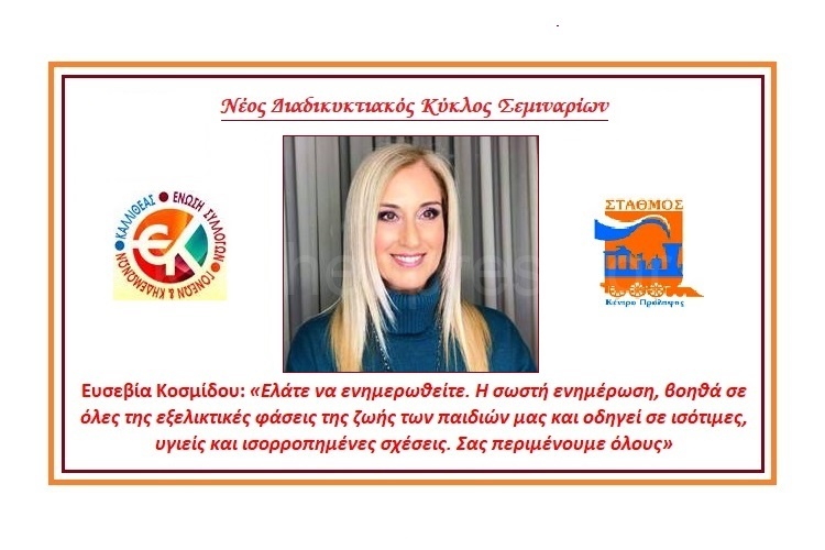 Η Ένωση Συλλόγων Γονέων & Κηδεμόνων Καλλιθέας παρουσιάζει νέο διαδικτυακό κύκλο Σεμιναρίων αυτή τη φορά σε συνεργασία με το Κέντρο Πρόληψης των Εξαρτήσεων & Προαγωγής της Ψυχοκοινωνικής Υγείας «Σταθμός», των Δήμων Καλλιθέας και Μοσχάτου – Ταύρου, με στόχο “τη στήριξη των γονέων στην αναζήτηση απαντήσεων που σχετίζονται με την καλή ψυχική υγεία των παιδιών και την καλή επικοινωνία μέσα στην οικογένεια.