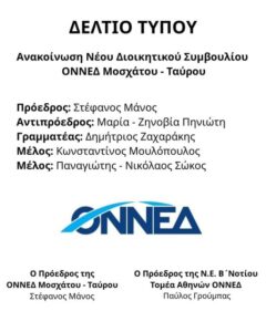 Η Τοπική Οργάνωση Νέων της Νέας Δημοκρατίας (ΟΝΝΕΔ) Μοσχάτου–Ταύρου ανακοινώνει τη συγκρότηση του νέου Διοικητικού της Συμβουλίου, σηματοδοτώντας την έναρξη μιας νέας περιόδου δυναμικής παρουσίας και ουσιαστικής παρέμβασης στα τοπικά δρώμενα. Με αίσθημα ευθύνης και διάθεση προσφοράς, το νέο Διιοικητικό Συμβούλιο , υπό την προεδρία του Στέφανου Μάνου, θέτει ως βασικές προτεραιότητες την ενίσχυση της συμμετοχής των νέων, την ανάδειξη των ζητημάτων που απασχολούν την περιοχή και τη συμβολή σε πρωτοβουλίες που προάγουν την κοινωνική συνοχή, την καινοτομία και την εξωστρέφεια.
