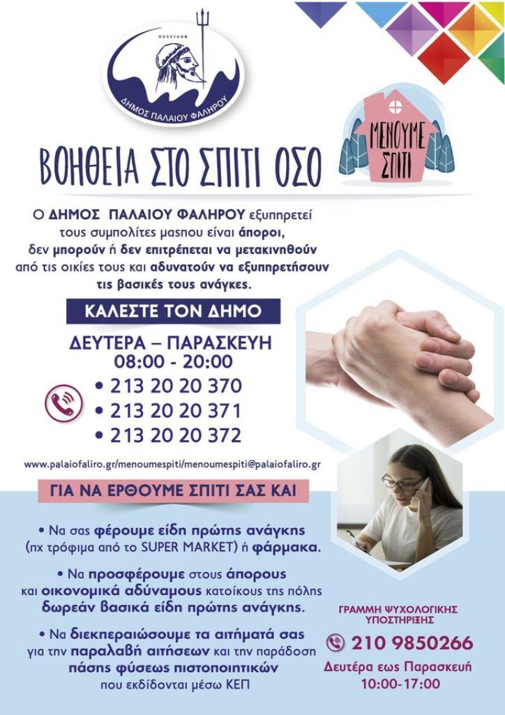 Να διεκπεραιώνουν κάθε άλλη εργασία συναφή με ληφθέντα μέτρα για την αποτροπή διάδοσης του COVID-19. Όπως και τον προηγούμενο Μάρτιο, έτσι και τώρα ο Δήμος Παλαιού Φαλήρου και οι Κοινωνικές του Υπηρεσίες βρίσκονται στην πρώτη γραμμή, απλώνοντας δίχτυ προστασίας ώστε κανένας ευπαθής συμπολίτης μας να μην μείνει ακάλυπτος.