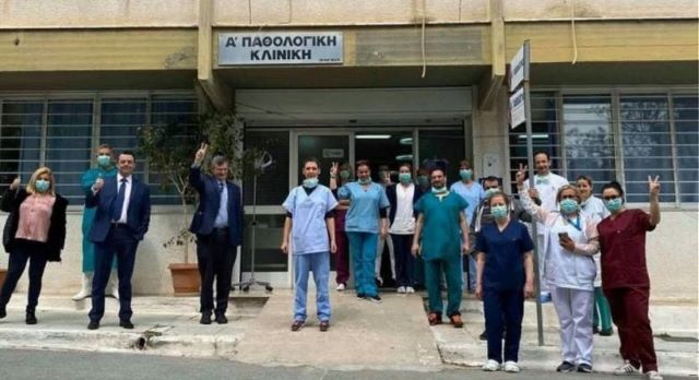 Κατά την επίσκεψή του, ο κ. Τσιόδρας φωτογραφήθηκε με τους υγειονομικούς, στέλνοντας με τα δάχτυλά του το μήνυμα της νίκης κατά του κορωνοϊού.