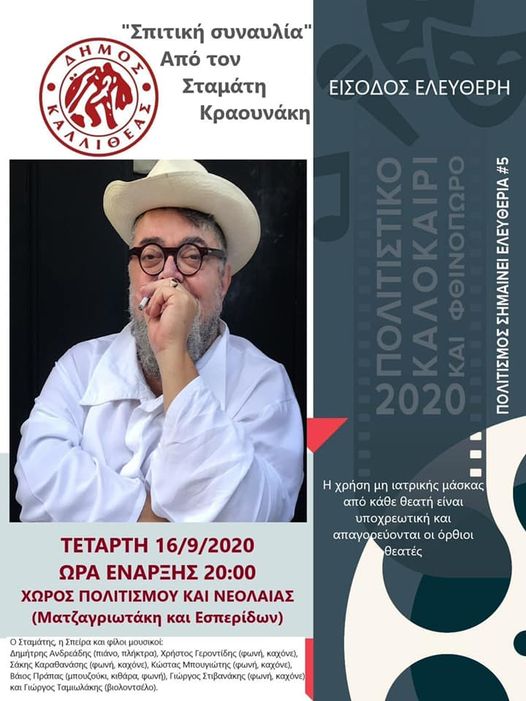Ο Σταμάτης Κραουνάκης είναι ένας καλλιτέχνης που αδιαμφισβήτητα έχει γράψει ιστορία και με τους στίχους και τη μουσική του. Για πρώτη φορά στις 16 Σεπτεμβρίου στις 20.00 στα πλαίσια των εκδηλώσεων του Δήμου Καλλιθέας, θα μας παρουσιάσει μια παράσταση μαζί με την Σπείρα Σπείρα και τους συνεργάτες του, στο χώρο πολιτισμού και νεολαίας Μαντζαγριωτάκη και Εσπερίδων.