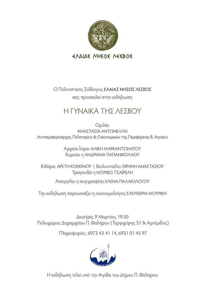 Ο “ΕΛΑΙΑΣ ΝΗΣΟΣ ΛΕΣΒΟΥ” τη Δευτέρα 9 Μαρτίου και ώρα 19.30 στον Πολυχώρο του Δημαρχείου Παλαιού Φαλήρου (Τερψιχόρης 51 και Αρτέμιδος). διοργανώνει εκδήλωση με θέμα “Η Γυναίκα της Λέσβου”