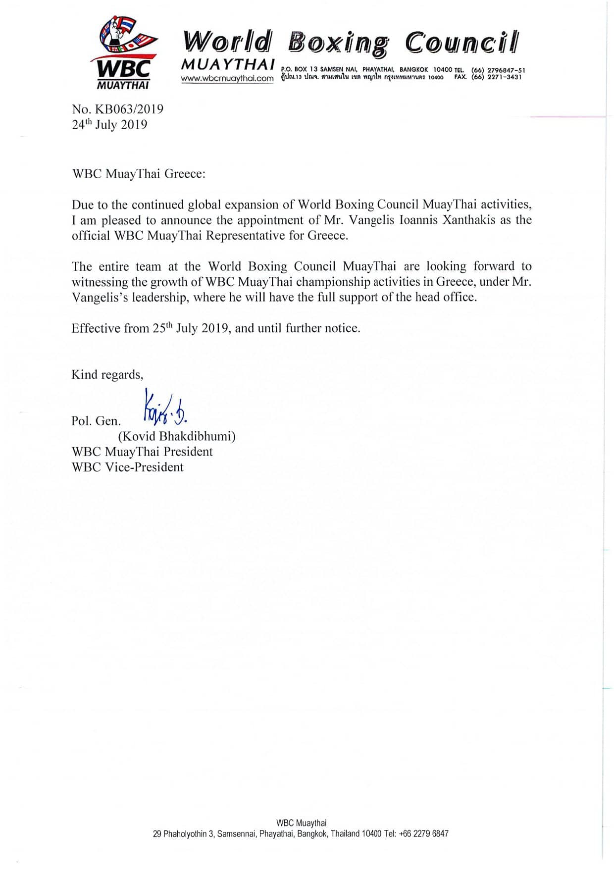 Την επιστολή την υπογράφει ο ίδιος ο Πρόεδρος της WBC Στρατηγός της Αυτού Μεγαλειότητας και της Βασιλικής Αστυνομίας της Ταϋλάνδης pol.Gen.Kovid Bhakdibhumi.