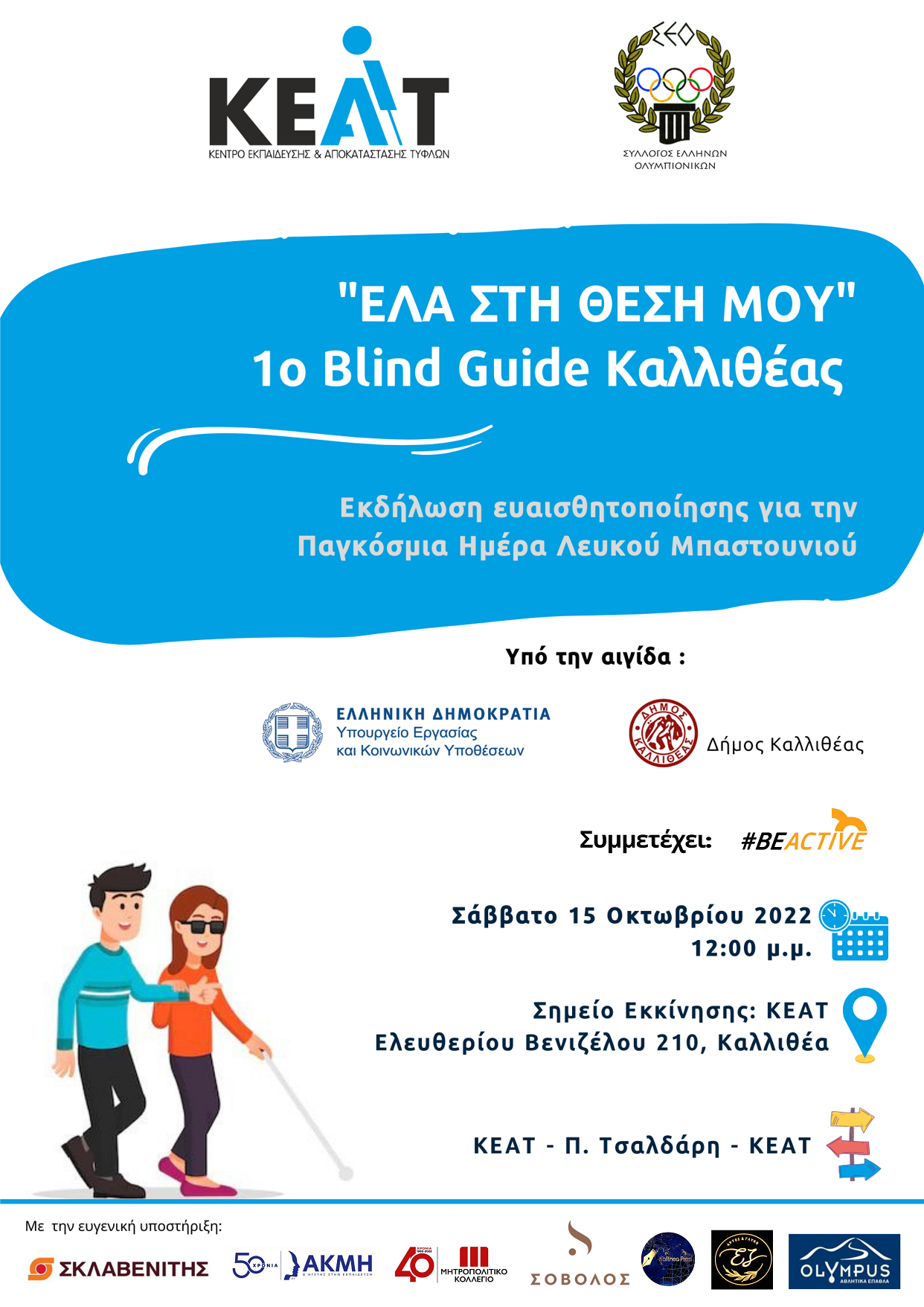 Να σημειωθεί ότι 1ο Blind Guide τελεί επίσης υπό την αιγίδα του δήμου Καλλιθέας ενώ συμμετέχει το πρόγραμμα #BeActive που προσέφερε ειδικό αθλητικό υλικό για την δράση το οποίο στην συνέχεια θα διατεθεί στο ΚΕΑΤ για την κάλυψη μέρους των αναγκών του και ο εκπαιδευτικός όμιλος Μητροπολιτικό – ΑΚΜΗ που θα υποστηρίξει βιντεοσκοπικά την εκδήλωση.