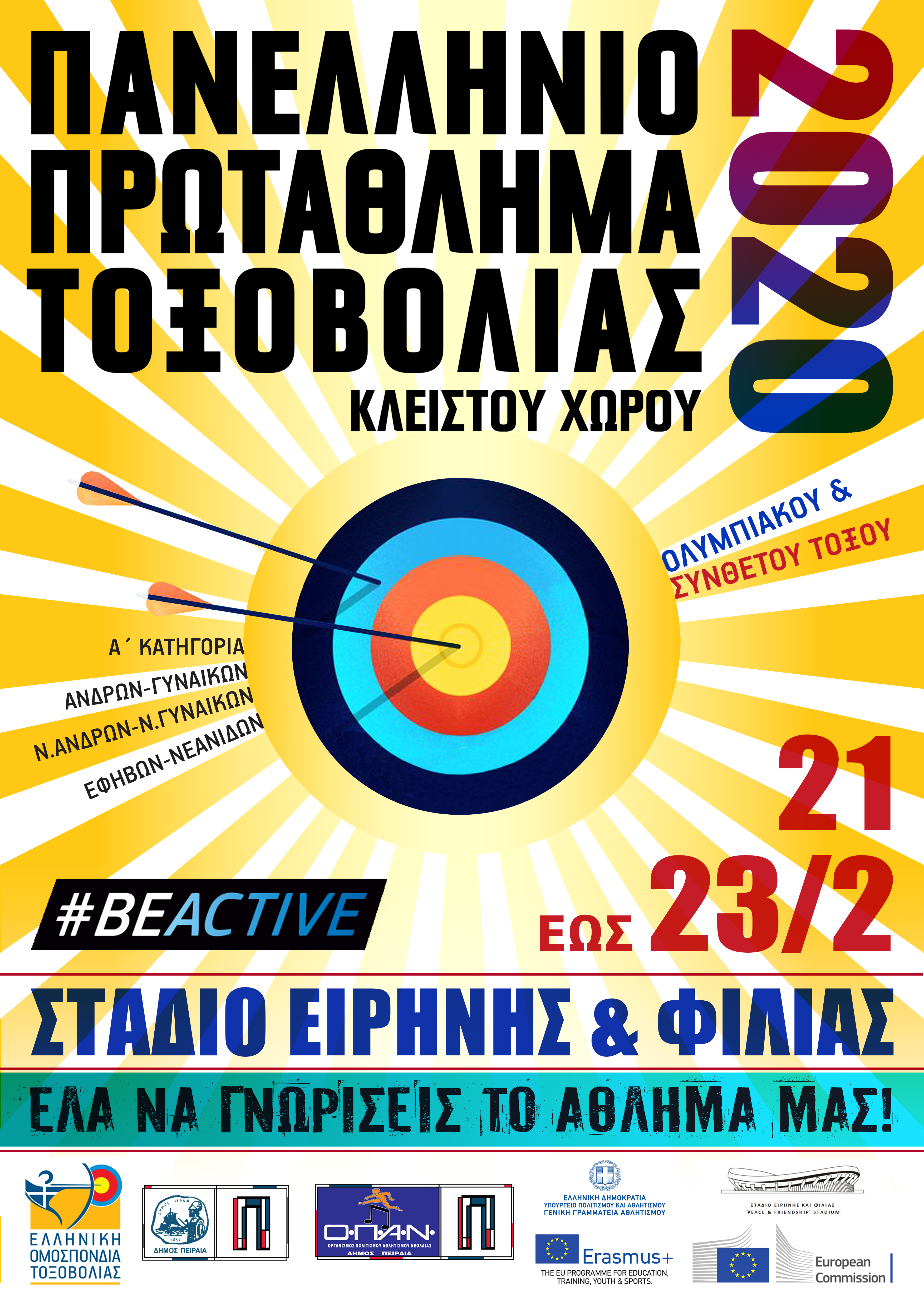 Με τη συμμετοχή των καλύτερων αθλητών και αθλητριών τοξοβολίας απ’ όλη την Ελλάδα διεξάγεται το τριήμερο 21-23 Φεβρουαρίου, το Πανελλήνιο Πρωτάθλημα κλειστού χώρου στην κεντρική σάλα του Σταδίου Ειρήνης και Φιλίας. Η είσοδος είναι ελεύθερη στη μεγαλύτερη ελληνική αθλητική διοργάνωση τοξοβολίας της χρονιάς και η Ελληνική Ομοσπονδία Τοξοβολίας έχει ετοιμάσει πολλές εκπλήξεις για μικρούς και μεγάλους. Είναι η πρώτη φορά aπό την ίδρυση της Ελληνικής Ομοσπονδίας Τοξοβολίας που που το ιστορικό Στάδιο Ειρήνης και Φιλίας φιλοξενεί στην κεντρική σάλα αγώνες τοξοβολίας και το θέαμα θα είναι εντυπωσιακό, τόσο στο Ολυμπιακό όσο και στο Σύνθετο τόξο, με τη συμμετοχή 300 αθλητών και αθλητριών.