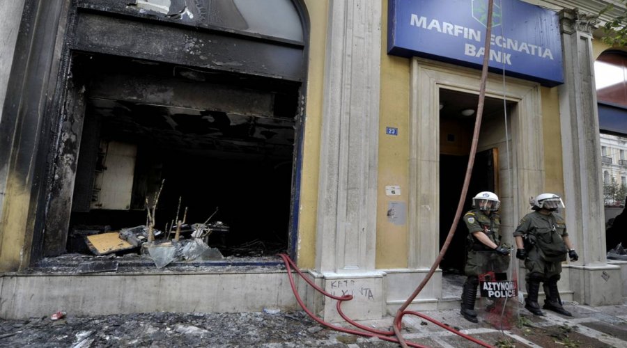 5 Μαΐου 2010, ώρα 14.00. Μια ομάδα κουκουλοφόρων αποκόπτεται από το μπλοκ των διαδηλωτών που κατευθύνεται προς την πλατεία Συντάγματος και κινείται προς την αντίθετη κατεύθυνση. Σε λίγα λεπτά το υποκατάστημα της Μarfin – Εgnatia Βank τυλίγεται στις φλόγες και τρεις εργαζόμενοι χάνουν τη ζωή τους.