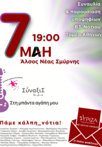Την Κυριακή 7 Μαίου 2023, ώρα 19.00, στο Άλσος Νέας Σμύρνης η Νομαρχιακή Επιτροπή Νότιας Αθήνας ΣΥΡΙΖΑ – Προοδευτική Συμμαχία διοργανώνει ανοιχτή πολιτική και μουσική εκδήλωση-συναυλία για την παρουσίαση των υποψήφιων βουλευτριών και βουλευτών του ψηφοδελτίου του Β3 Νότιου Τομέα Αθήνας.