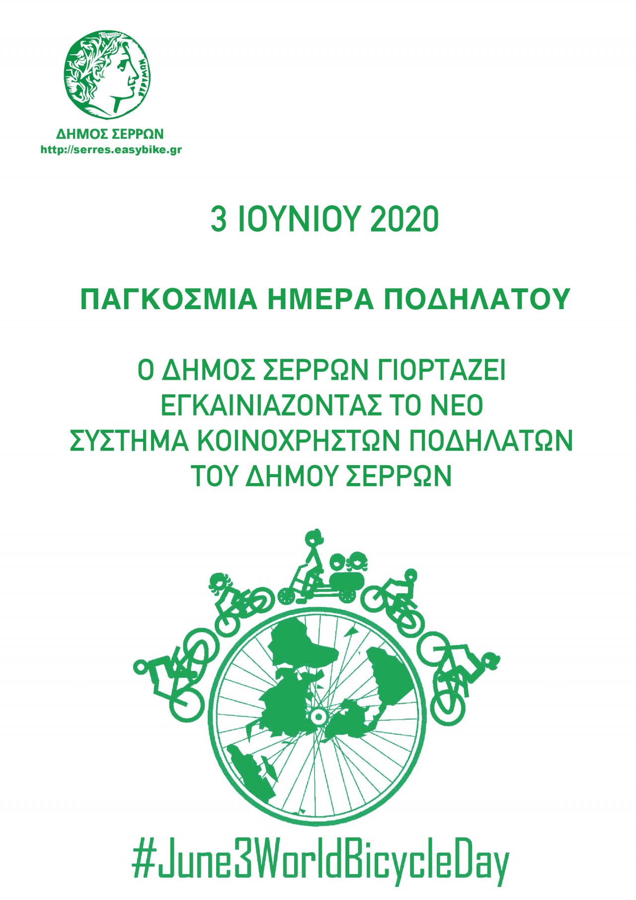 “Στο πλαίσιο των εκδηλώσεων για την Παγκόσμια Ημέρα Ποδηλάτου, ο Δήμος Σερρών προσκαλεί τους πολίτες την Τετάρτη, 3 Ιουνίου 2020, και ώρα 12:00 μ.μ., στην Πλατεία Ελευθερίας, στην εκδήλωση παρουσίασης του νέου συστήματος κοινόχρηστων ποδηλάτων.