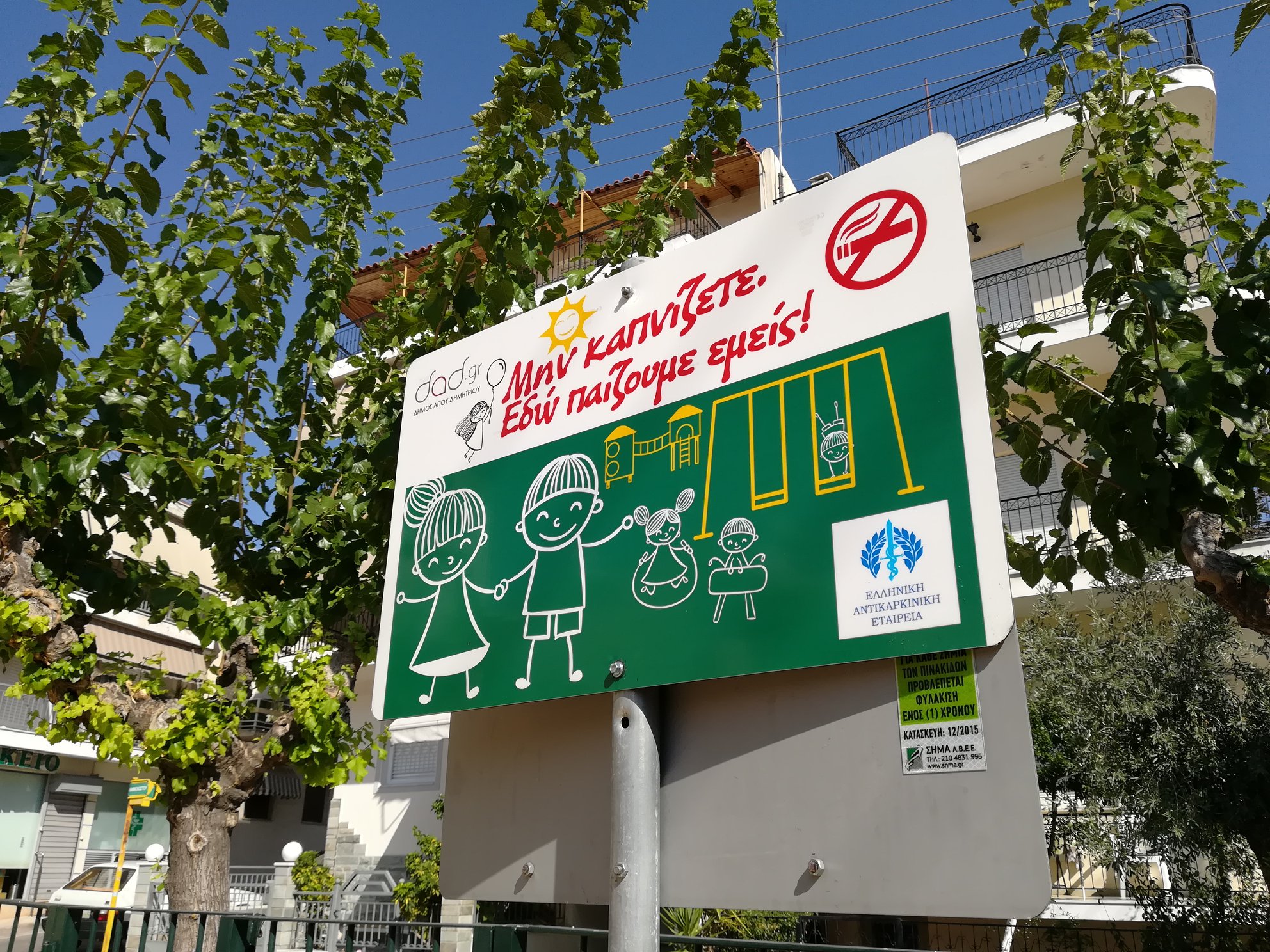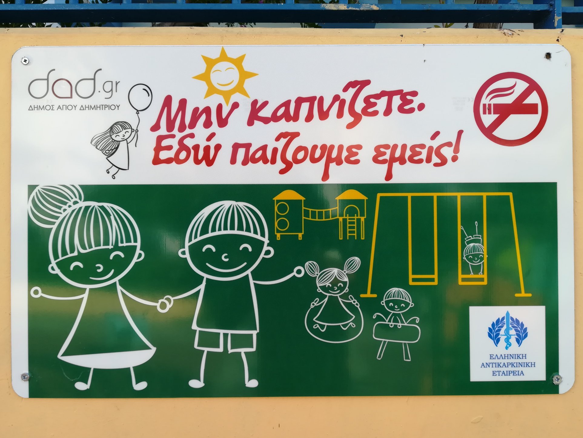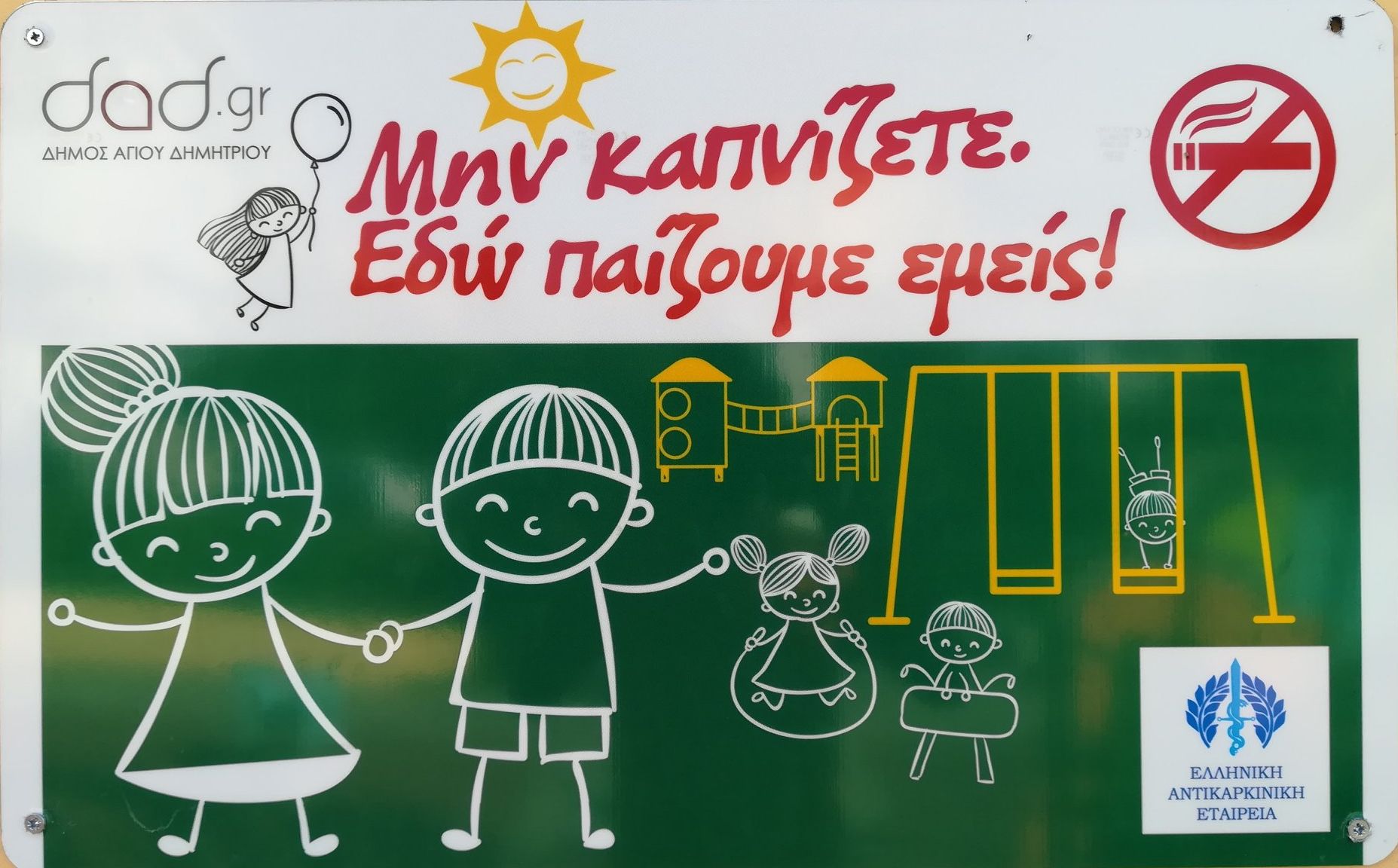 Η πόλη του Αγίου Δημητρίου συμμετέχει επίσημα στην Πανελλαδική εκστρατεία της Ελληνικής Αντικαρκινικής Εταιρείας, για την ευαισθητοποίηση των γονέων και την αποφυγή του καπνίσματος στις Παιδικές χαρές, προχωρώντας στην τοποθέτηση ειδικής σήμανσης με την ένδειξη «Μην καπνίζετε. Εδώ παίζουμε εμείς!» στις παιδικές χαρές όλου του Δήμου.