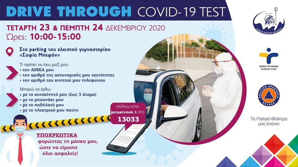 Ο Δήμος Καλλιθέας σε συνεργασία με τον ΕΟΔΥ, θα διενεργήσει rapid tests COVID-19 με τη μέθοδο drive through (μέσα από το αυτοκίνητο), την Τετάρτη 23/12 & την Πέμπτη 24/12, από τις 10 π. μ έως τις 15.00 μ.μ. στον Δήμο Παλαιού Φαλήρου και συγκεκριμένα στο παρκινγκ του Κλειστού Γυμναστηρίου ΣΟΦΙΑ ΜΠΕΦΟΝ.
