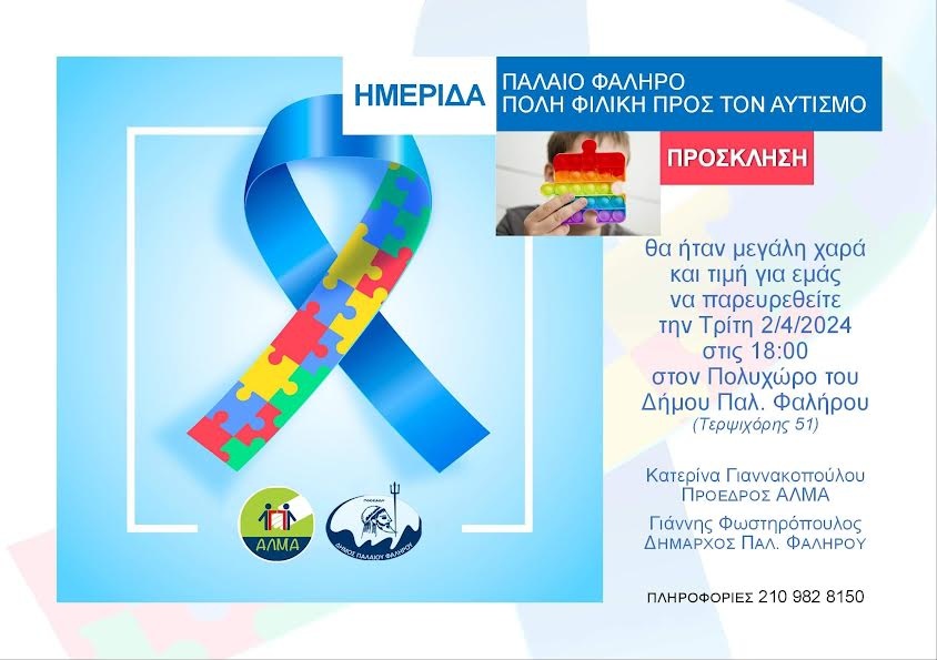 Ο Δήμος Παλαιού Φαλήρου και ο Πανελλήνιος Σύλλογος Προσαρμοσμένων Δραστηριοτήτων ΑΛΜΑ συνδιοργανώνουν μία διαδραστική , σπονδυλωτή ημερίδα με τίτλο “Παλαιό Φάληρο, πόλη φιλική προς τον αυτισμό. Άτομα στο φάσμα του αυτισμού θα μας διηγηθούν τις δικές τους ιστορίες επιτυχίας, θα μας εμπιστευθούν τη δική τους προσωπική εμπειρία άνθρωποι που ζουν καθημερινά κοντά σε νευροδιαφορετικά άτομα , θα θέσουμε θέματα και ερωτήματα για τη συμπερίληψη στην πράξη και θα μας διαφωτίσουν για το θέμα ειδικοί παιδαγωγοί και ψυχολόγοι. Θα αναφερθούμε σε συνεργασίες του ΑΛΜΑ με σχολεία της πόλης μας,για το ΑΛΜΑ στην κοινότητα αλλά και στο πρόγραμμα των παιδικών σταθμών.