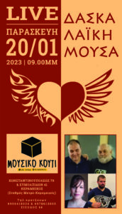 Οι Ματθαίος Χριστοδούλου και Κώστας Τσιμπίδας, παραγωγοί – καλλιτέχνες του Kalithea Radio, , συνεχίζοντας με την μπάντα τους “ΔΑΣΚΑΛΑΙΚΗ ΜΟΥΣΑ”, την πολύ καλή πορεία τους, παρουσιάζουν στον χώρο “ΜΟΥΣΙΚΟ ΚΟΥΤΙ” ( Κωνσταντινουπόλεως 70,Ευμολπίδων 41 στον Κεραμεικό) την Παρασκευή 20 Ιανουαρίου και ώρα 21.00, ένα πρόγραμμα γεμάτο με μουσικές που παίζουν και τραγουδούν οι ίδιοι οι καλλιτέχνες. Σας ευχόμαστε να είναι μια ζεστή και δυναμική βραδιά, όπως πάντα.