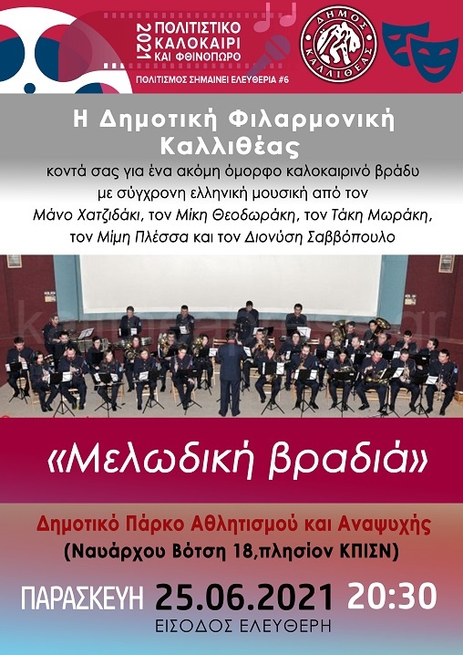 Στα πλαίσια των εκδηλώσεων του Δήμου Καλλιθέας Πολιτιστικό Καλοκαίρι και Φθινόπωρο Καλλιθέας 2021 παρασκευή 25 Ιουνίου στις 20.30 στο Δημοτικό Πάρκο Αθλητισμού και Αναψυχής (Ναυάρχου Βότση 18, πλησίον ΚΠΙΣΝ) η δημοτική φιλαρμονική Καλλιθέας μας υπόσχεται μια «Μελωδική βραδιά»