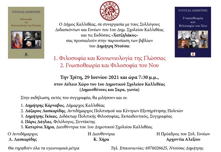 Στα πλαίσια των εκδηλώσεων του Δήμου Καλλιθέας Πολιτιστικό Καλοκαίρι και Φθινόπωρο 2021 την Τρίτη, 29 Ιουνίου 2021 και ώρα 19:30 μ.μ., στον προάυλειο Χώρο του 1ου Δημοτικού Σχολείου Καλλιθέας (Δημοσθένους & Σκρα, γωνία) θα παρουσιαστούν από τον συγγραφέα Δημήτρη Ντούσια τα δύο βιβλία του Φιλοσοφία και Κοινωνιολογία της Γλώσσας και Γνωσιοθεωρία και Φιλοσοφία του Νου