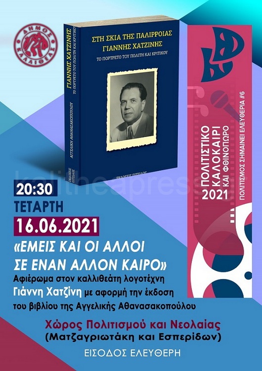 Στα πλαίσια των εκδηλώσεων του Δήμου Καλλιθέας “«Πολιτιστικό Καλοκαίρι και Φθινόπωρο 2021» σήμερα στο χώρο Πολιτισμού και Νεολαίας στην Μαντζαγριωτάκη και Εσπερίδων θα πραγματοποιηθεί εκδήλωση “Αφιέρωμα στον καλλιθεάτη λογοτέχνη Γιάννη Χατζίνη με αφορμή την έκδοση του βιβλίου της Δρ Αγγελικής Αθανασακοπούλου ” ΣΤΗ ΣΚΙΑ ΤΗΣ ΠΑΛΙΡΡΟΙΑΣ-Το πορτρέτο του πολίτη και κριτικού”