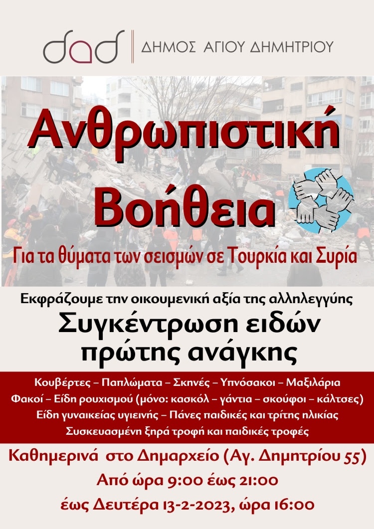 Ο Δήμος Άγιου Δημήτριου όπως και άλλοι Δήμοι της Αττικής ανταποκρινόμενος στην επιστολή της ΚΕΔΕ 6/2/2023 για αποστολή ανθρωπιστικής βοήθειας στα θύματα των σεισμών σε Τουρκία και Συρία. Συμμετέχει συγκεντρώνουμε τα είδη πρώτης ανάγκης καθημερινά από ώρα 9:00 έως 21:00, στο Δημαρχείο (Αγίου Δημητρίου 55), μέχρι τη Δευτέρα 13-2-2023, ώρα 16:00.