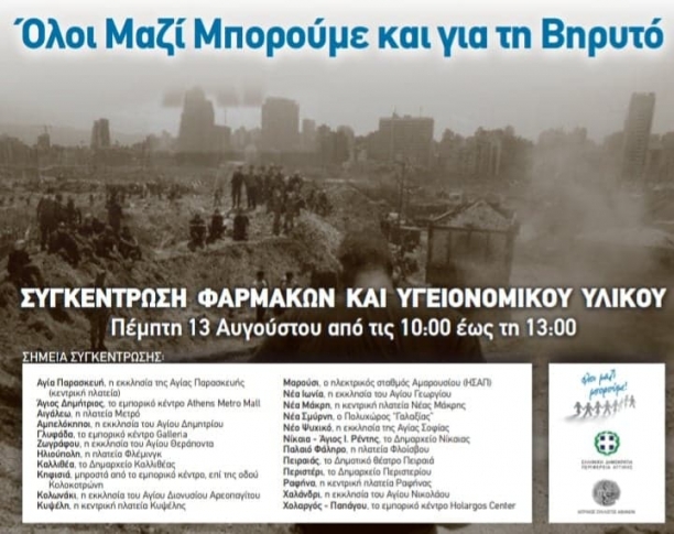 Η Περιφέρεια Αττικής σε συνεργασία με τον Ιατρικό Σύλλογο Αθηνών και το «Όλοι Μαζί Μπορούμε» του ραδιοτηλεοπτικού σταθμού ΣΚΑΙ διοργανώνουν δράση για τη συγκέντρωση φαρμάκων και υγειονομικού υλικού, με στόχο τη στήριξη των πληγέντων της Βηρυτού.