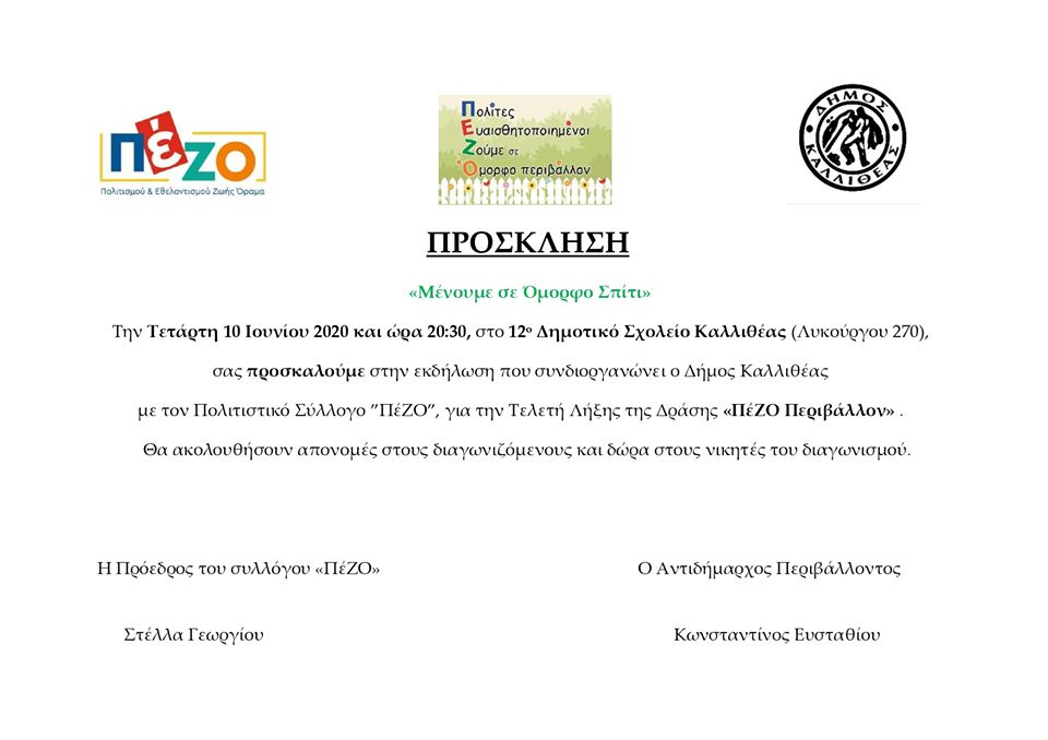 Παγκόσμια ημέρα Περιβάλλοντος σήμερα κι ο ΠέΖΟ μαζί με τον Δήμο Καλλιθέας & τον Αντιδήμαρχο Περιβάλλοντος Κώστα Ευσταθίου σας προσκαλούν στην γιορτή λήξης της δράσης ΠΕΖΟ ΠΕΡΙΒΑΛΛΟΝ. Θα τιμήσουμε όλους όσους συμμετείχαν στον διαγωνισμό μας και τους νικητές μας. Την Τετάρτη 10 Ιουνίου και ώρα 20:30, στην μεγάλη αυλή του 12ου Δημοτικού Σχολείου, παρέα με την καλοκαιρινή μας διάθεση και κρατώντας τις απαραίτητες αποστάσεις, γιορτάζουμε όλοι μαζί την ημέρα του Περιβάλλοντος