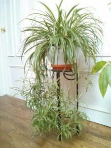 Ένα φυτό που φιλτράρει εξαιρετικά τον αέρα και καθαρίζει την ατμόσφαιρα του κλειστού χώρου από ρύπους. Γνωστό και σαν φυτό αράχνη, με όμορφα πράσινα και μπεζ λογχοειδή φύλλα και ανάγκες ποτίσματος πιο αυξημένες από άλλα είδη. Ποτίζουμε περίπου δύο φορές την εβδομάδα το καλοκαίρι και μειώνουμε τον χειμώνα σε μία. Τοποθετώντας το σε ένα ψηλό σημείο θα δούμε μετά από λίγο καιρό να παράγει επιμήκεις μίσχους που στην άκρη τους δημιουργούνται μικρά φυτά που κρέμονται ακτινωτά. Από αυτά τα μικρά φυτά μπορούμε να δημιουργήσουμε νέα πολύ εύκολα. Αυτό γίνεται με δύο τρόπους, είτε με καταβολίδες, φυτεύοντας δηλαδή τα μικρά φυτά σε διπλανή