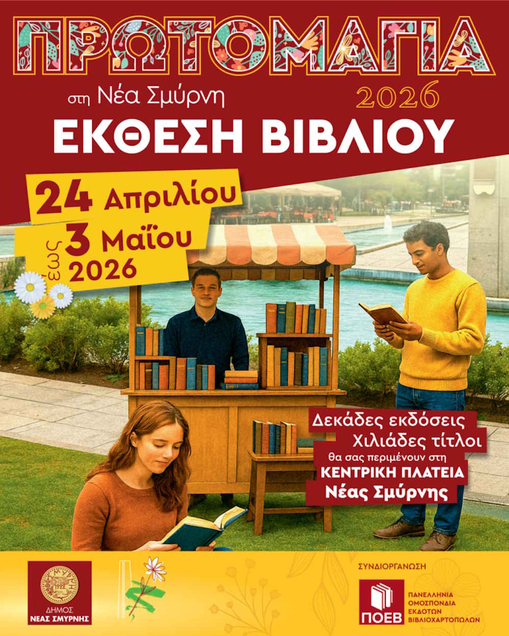 Η Πλατεία Νέας Σμύρνης μετατρέπεται από τις 24 Απριλίου έως τις 3 Μαΐου σε έναν ζωντανό πυρήνα πολιτισμού, φιλοξενώντας τη μεγάλη Έκθεση Βιβλίου που συγκεντρώνει δεκάδες εκδοτικούς οίκους και χιλιάδες τίτλους για κάθε αναγνωστικό κοινό. Η διοργάνωση πραγματοποιείται στο πλαίσιο των Πρωτομαγιάτικων εκδηλώσεων και αποτελεί συνδιοργάνωση του Δήμου Νέας Σμύρνης και της Πανελλήνιας Ομοσπονδίας Εκδοτών Βιβλιοχαρτοπωλών.