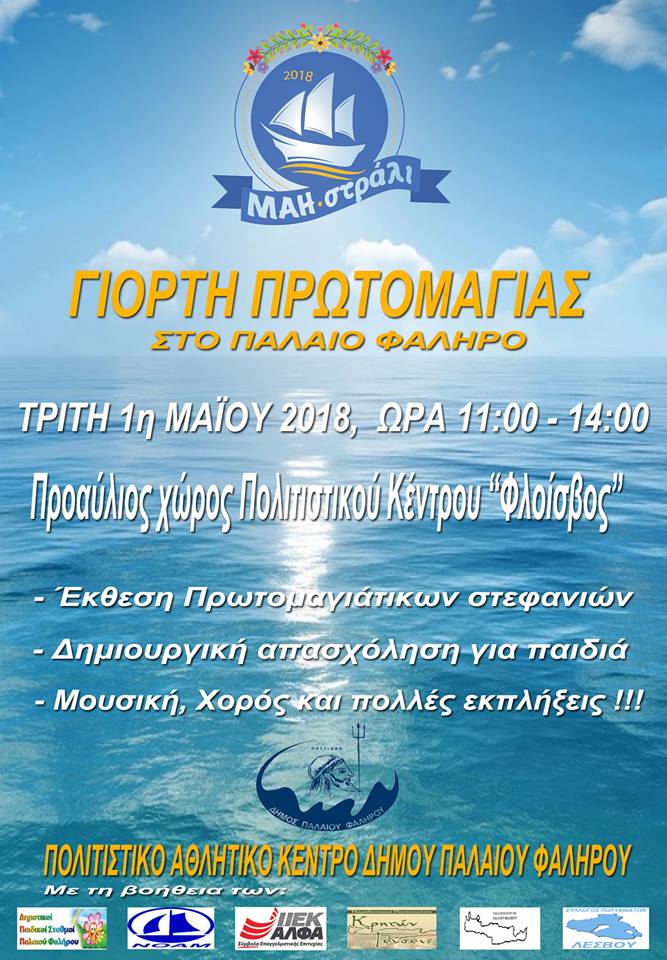 Η Γιορτή Πρωτομαγιάς «ΜΑΗ-στραλι 2018» θα πραγματοποιηθεί την Τρίτη, 1η Μαΐου και ώρα 11:00 – 14:00 στον προάυλιο χώρο όπισθεν του Πολιτιστικού Κέντρου «Φλοίσβος» (Λεωφ. Ποσειδώνος). Μια ημέρα που όλοι θέλουμε να γίνει θεσμός και που θα αναδεικνύει τις ιδιαίτερες ομορφιές της πόλης μας, το γαλάζιο της θάλασσας και το πράσινο των πάρκων μας μαζί με τα χρώματα της Πρωτομαγιάς αγκαλιάζοντας όλους εσάς που θα θελήσετε να περάσετε την ξεχωριστή αυτή ημέρα μαζί μας. Σας περιμένουμε σε μια όμορφη γωνιά, πίσω απο το Πολιτιστικό Κέντρο «Φλοίσβος» να καλωσορίσουμε τον Μάη με μουσική από το συγκρότημα «Συγχορδία» και τραγούδια των Πλέσσα, Ξαρχάκου, Λοΐζου, Σπάνου και άλλων αγαπημένων συνθετών, με παραδοσιακούς χορούς, με έκθεση πρωτομαγιάτικων στεφανιών, με δημιουργικές δραστηριότητες για τους μικρούς μας φίλους, και μια σειρά άλλων εκπλήξεων.