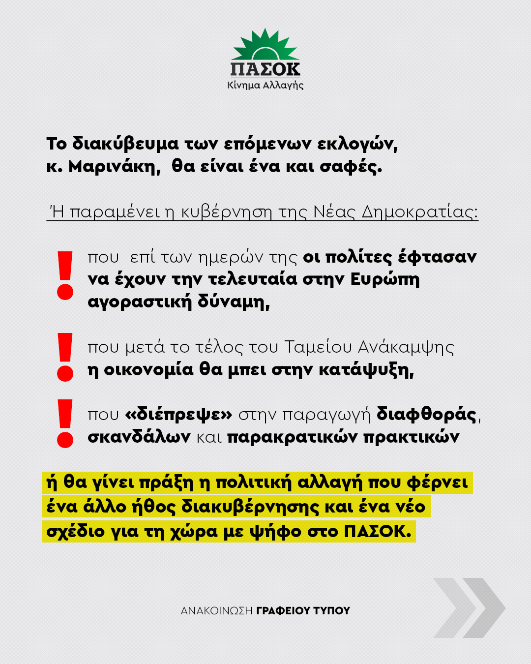 Σύμφωνα με το δελτίο τύπου, το ΠΑΣΟΚ απευθύνεται στον κυβερνητικό εκπρόσωπο, κ. Μαρινάκη, θέτοντας ένα σαφές δίλημμα για την επόμενη εκλογική αναμέτρηση. Συγκεκριμένα, κατηγορεί τη διακυβέρνηση της Νέας Δημοκρατίας για: