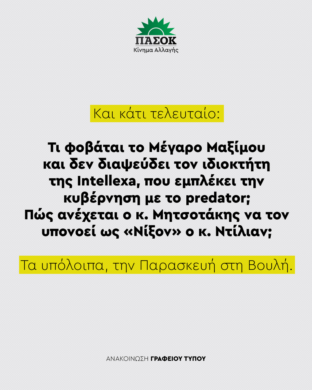 Το δελτίο τύπου κλείνει με σκληρή γλώσσα για το ζήτημα των παρακολουθήσεων. Το ΠΑΣΟΚ θέτει ερωτήματα προς το Μέγαρο Μαξίμου σχετικά με την Intellexa και το λογισμικό Predator, ζητώντας εξηγήσεις για τη στάση της κυβέρνησης απέναντι στον ιδιοκτήτη της εταιρείας, κ. Ντίλιαν. Μάλιστα, γίνεται αναφορά σε υπαινιγμούς που παραλληλίζουν τον Πρωθυπουργό με τον «Νίξον», καλώντας τον κ. Μητσοτάκη να πάρει θέση.