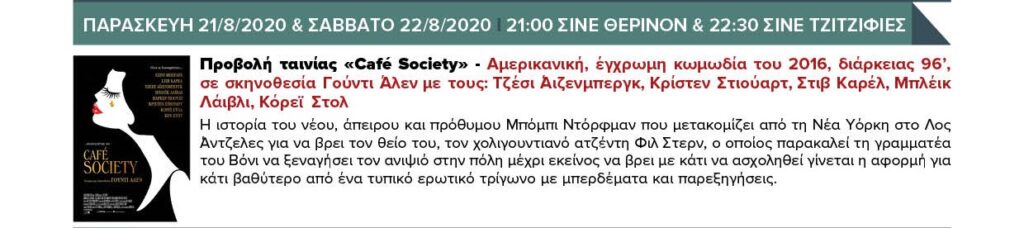 ΣΑΒΒΑΤΟ 22/8/2020 21:00 ΣΙΝΕ ΘΕΡΙΝΟΝ & 22:30 ΣΙΝΕ ΤΖΙΤΖΙΦΙΕΣ – Προβολή ταινίας «Café Society»