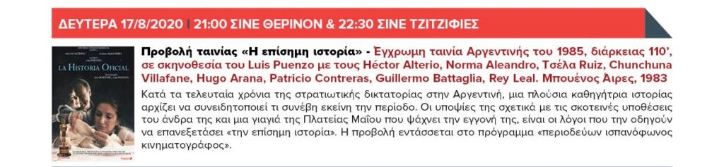 ΔΕΥΤΕΡΑ 17/8/2020 21:00 ΣΙΝΕ ΘΕΡΙΝΟΝ & 22:30 ΣΙΝΕ ΤΖΙΤΖΙΦΙΕΣ – Προβολή ταινίας «Η επίσημη ιστορία»