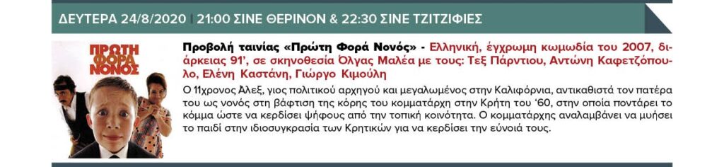 ΔΕΥΤΕΡΑ 24/8/2020 21:00 ΣΙΝΕ ΘΕΡΙΝΟΝ & 22:30 ΣΙΝΕ ΤΖΙΤΖΙΦΙΕΣ – Προβολή ταινίας «Πρώτη φορά νονός»