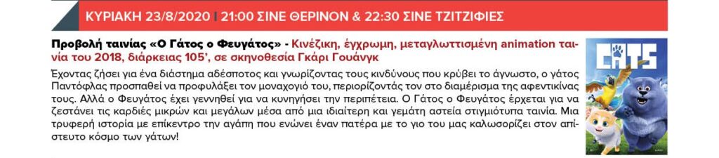 ΚΥΡΙΑΚΗ 23/8/2020 21:00 ΣΙΝΕ ΘΕΡΙΝΟΝ & 22:30 ΣΙΝΕ ΤΖΙΤΖΙΦΙΕΣ – Προβολή ταινίας «Ο Γάτος ο Φευγάτος»