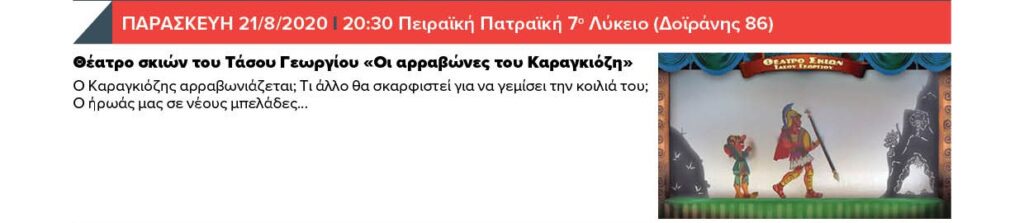 ΠΑΡΑΣΚΕΥΗ 21/8/2020 20:30 Πειραϊκή Πατραϊκή 7ο Λύκειο (Δοϊράνης 86) – Θέατρο σκιών του Τάσου Γεωργίου «Οι αρραβώνες του Καραγκιόζη» & 21:00 ΣΙΝΕ ΘΕΡΙΝΟΝ & 22:30 ΣΙΝΕ ΤΖΙΤΖΙΦΙΕΣ – Προβολή ταινίας «Café Society»