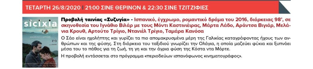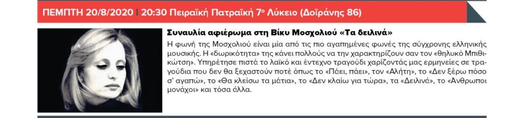 ΠΕΜΠΤΗ 20/8/2020 20:30 Πειραϊκή Πατραϊκή 7ο Λύκειο (Δοϊράνης 86) – Συναυλία αφιέρωμα στη Βίκυ Μοσχολιού «Τα δειλινά» & 21:00 ΣΙΝΕ ΘΕΡΙΝΟΝ & 22:30 ΣΙΝΕ ΤΖΙΤΖΙΦΙΕΣ – Προβολή ταινίας «Μπαρ El Chino»