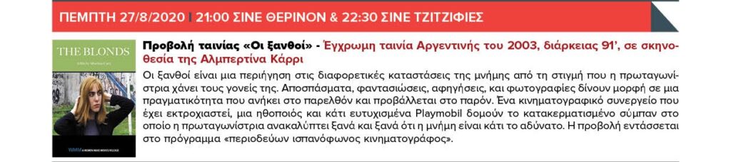 ΠΕΜΠΤΗ 27/8/2020 20:30 Πάρκο «ΜΕΛΙΝΑ ΜΕΡΚΟΥΡΗ» (Μεγίστης 18-20) – Συναυλία αφιέρωμα στις δεκαετίες του ’60 και ’70 «Πόσα καλοκαίρια» & 21:00 ΣΙΝΕ ΘΕΡΙΝΟΝ & 22:30 ΣΙΝΕ ΤΖΙΤΖΙΦΙΕΣ – Προβολή ταινίας «Οι ξανθοί»