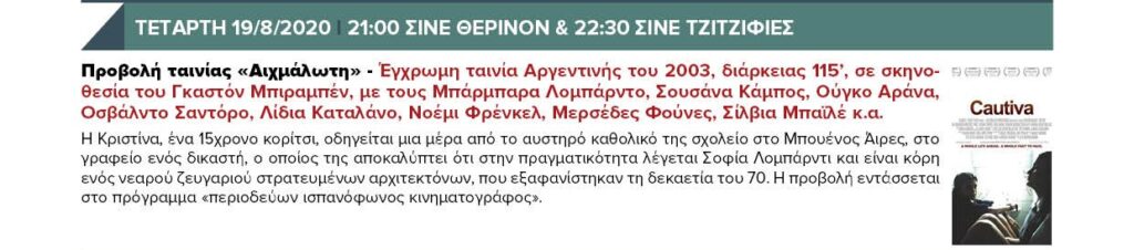 ΤΕΤΑΡΤΗ 19/8/2020 21:00 ΣΙΝΕ ΘΕΡΙΝΟΝ & 22:30 ΣΙΝΕ ΤΖΙΤΖΙΦΙΕΣ – Προβολή ταινίας «Αιχμάλωτη»