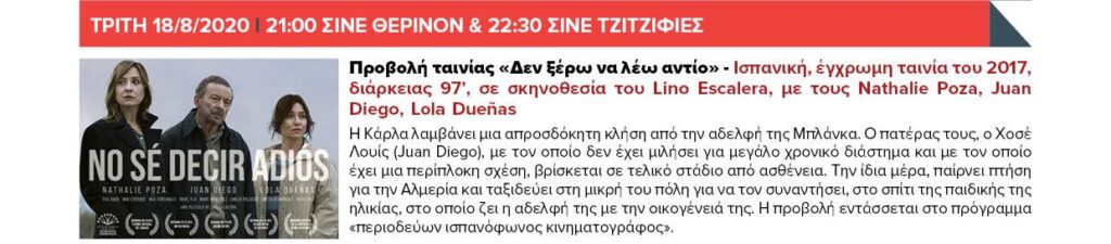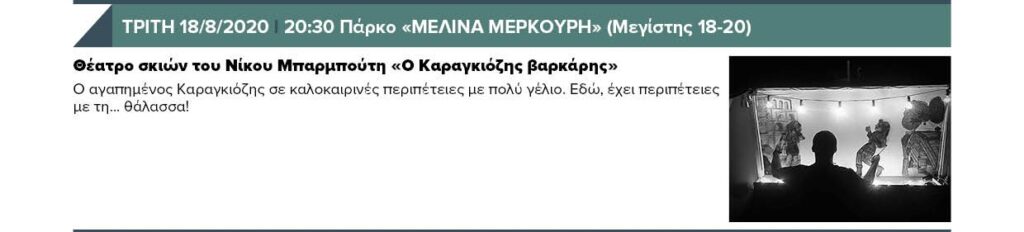 ΤΡΙΤΗ 18/8/2020 20:30 Πάρκο «ΜΕΛΙΝΑ ΜΕΡΚΟΥΡΗ» (Μεγίστης 18-20) – Θέατρο σκιών του Νίκου Μπαρμπούτη «Ο Καραγκιόζης βαρκάρης» & 21:00 ΣΙΝΕ ΘΕΡΙΝΟΝ & 22:30 ΣΙΝΕ ΤΖΙΤΖΙΦΙΕΣ – Προβολή ταινίας «Δεν ξέρω να λέω αντίο»