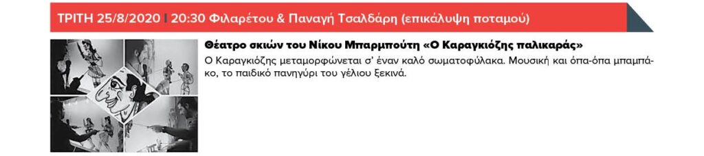 ΤΡΙΤΗ 25/8/2020 20:30 Φιλαρέτου & Παναγή Τσαλδάρη (επικάλυψη ποταμού) – Θέατρο σκιών του Νίκου Μπαρμπούτη «Ο Καραγκιόζης παλικαράς» & 21:00 ΣΙΝΕ ΘΕΡΙΝΟΝ & 22:30 ΣΙΝΕ ΤΖΙΤΖΙΦΙΕΣ – Προβολή ταινίας «Η κατεδάφιση»