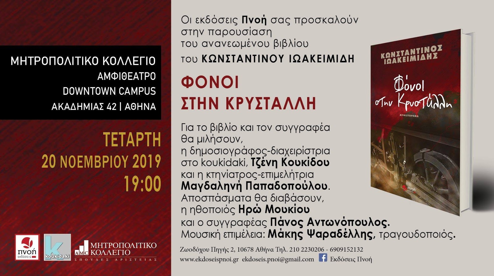 Στο Μητροπολιτικό Κολέγιο, Downtown Campus, Ακαδημίας 47, Αθήνα, την Τετάρτη 20/11/2019 στις 19.00, οι εκδόσεις ΠΝΟΗ και ο Κωνσταντίνος Ιωακειμίδης σας παρουσιάζουν το βιβλίο του “Φόνοι στην Κρυστάλλη”