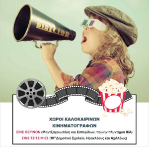 Καθημερινά ως τις 6 Σεπτεμβρίου θα πραγματοποιούνται δύο προβολές κινηματογραφικών ταινιών, στις 9 μ.μ. στο «Σινέ Θερινόν» (Μαντζαγριωτάκη και Εσπερίδων) και στις 10 μ.μ στο «Σινέ Τζιτζιφιές» (Ηρακλέους και Αχιλλέως, 10ο Δημοτικό Σχολείο).