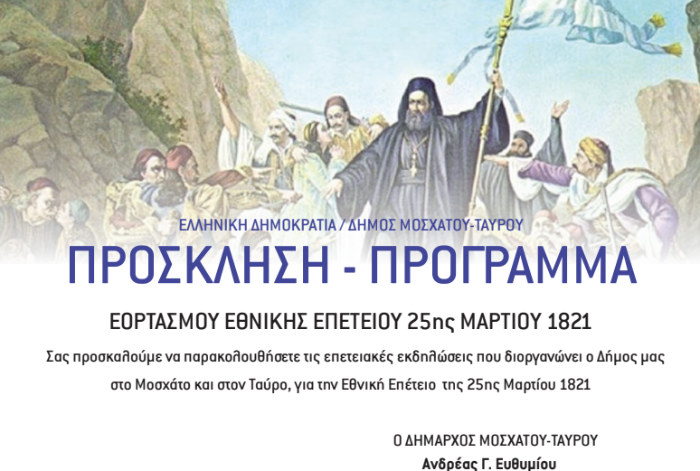 Σας προσκαλούμε να παρακολουθήσετε τις επετειακές εκδηλώσεις που διοργανώνει ο Δήμος μας στο Μοσχάτο και τον Ταύρο, για την Εθνική Επέτειο της 25ης Μαρτίου 1821