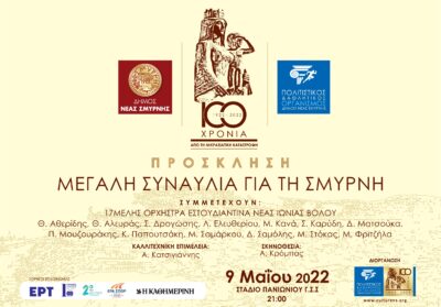 Με αφορμή την συμπλήρωση 100 χρόνων από την μικρασιατική καταστροφη, ο Δήμος Νέας Σμύρνης σας προσκαλεί στη μεγάλη επετειακή συναυλία για τη