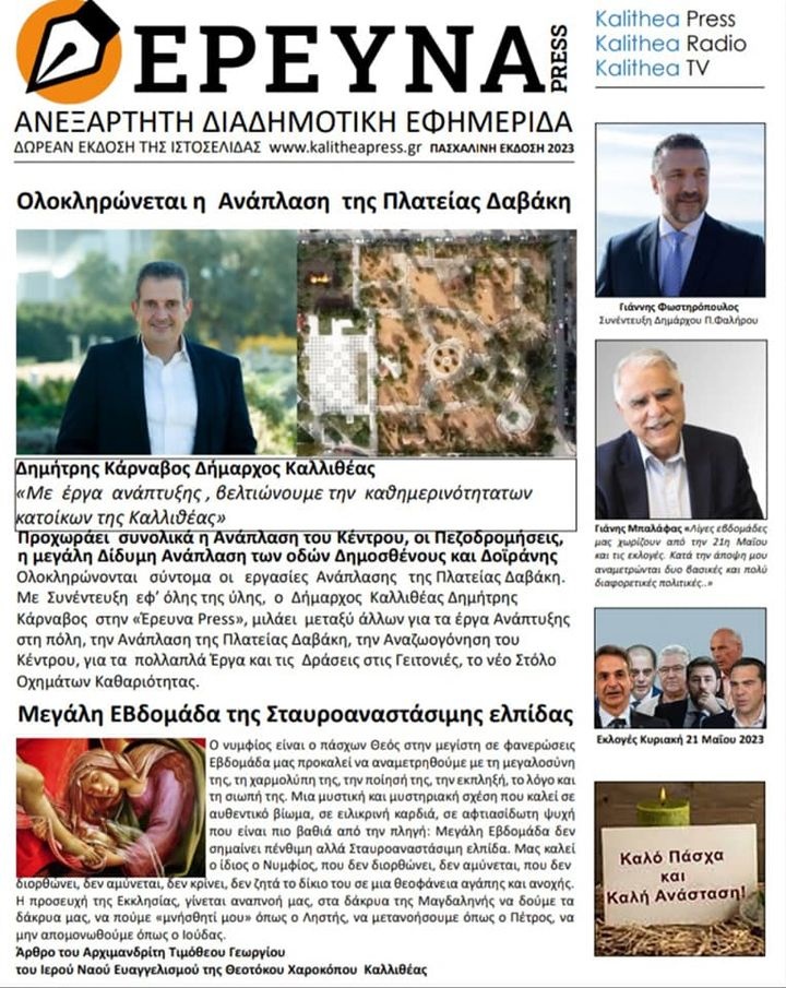 Η δωρεάν διαδημοτική εφημερίδα “Έρευνα Press” με συνεντεύξεις και ρεπορτάζ που θα συζητηθούν την Μεγάλη Εβδομάδα κοντά σας…