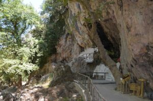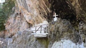 Πιο ψηλά σκαμμένη κάτω από το γκρεμό, δίπλα στο εκκλησάκι σε μια βραχώδη προεξοχή, υπήρχε ο βωμός του παγανιστικού ιερού.