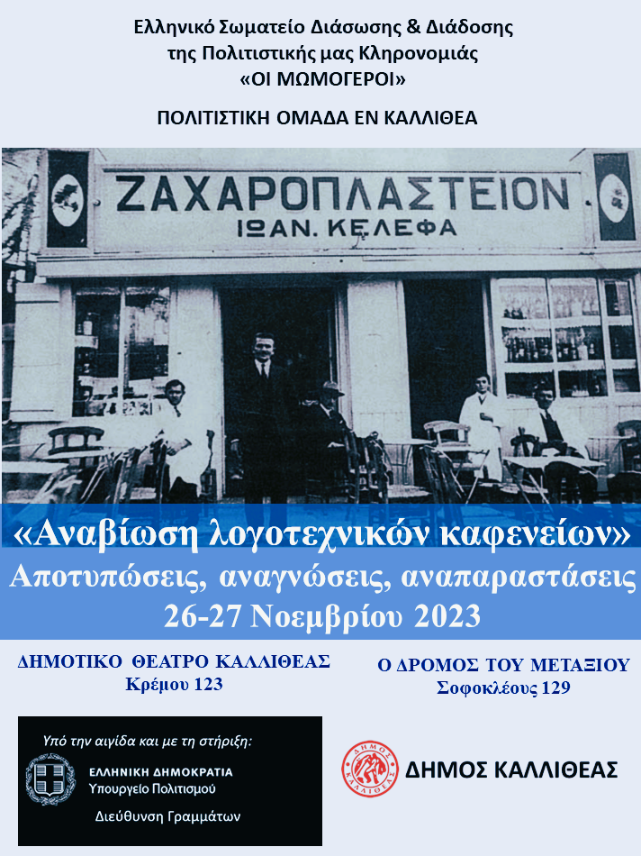 “ΟΙ ΜΩΜΟΓΕΡΟΙ” και η πολιτιστική ομάδα “ΕΝ ΚΑΛΛΙΘΕΑ” παρουσιάζουν την διημερίδα “Αναβίωση Λογοτεχνικών Καφενείων Αποτυπώσεις Αναγνώσεις Αναπαραστάσεις 26-27 Νοεμβρίου υπό την αιγίδα του Υπουργείου Πολιτισμού Διεύθυνσης Γραμμάτων και με την στήριξη Δήμου Καλλιθέας.