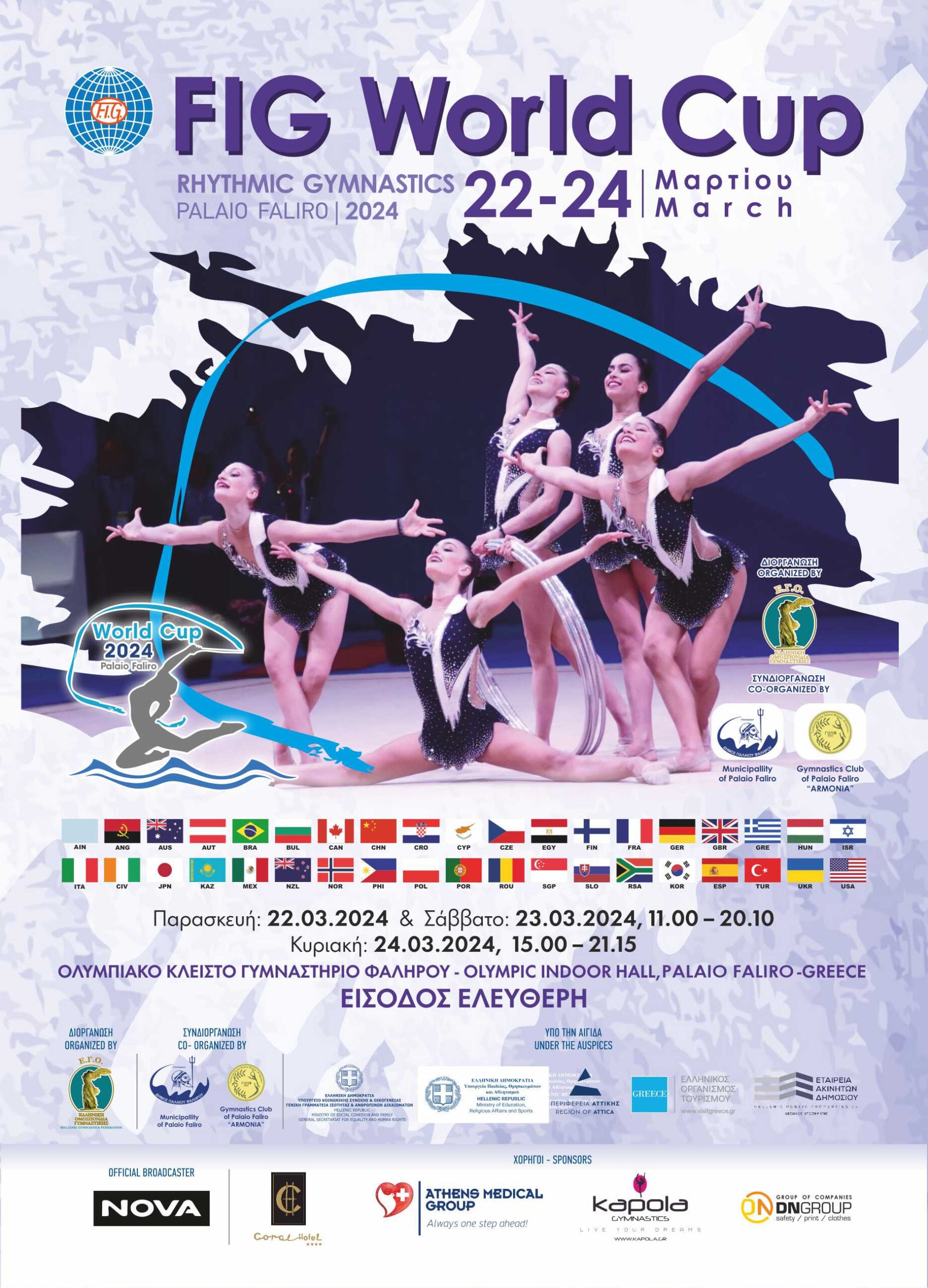 Το Παγκόσμιο Κύπελλο Ρυθμικής Γυμναστικής – FIG World Cup 2024 αρχίζει την Παρασκευή 22 Μάρτη, στο Ολυμπιακό Κλειστό Γυμναστήριο Φαλήρου (Tae Kwon Do) και θα διαρκέσει μέχρι την Κυριακή 24 Μάρτη.