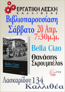 Το Σάββατο 20 Απριλίου στις 7:30 μ.μ. η Εργατική Λέσχη Καλλιθέας θα φιλοξενήσει τον Θανάση Σκρουμπέλο, ο οποίος θα μας παρουσιάσει το βιβλίο του «Bella Ciao» από τις εκδόσεις Τόπος.